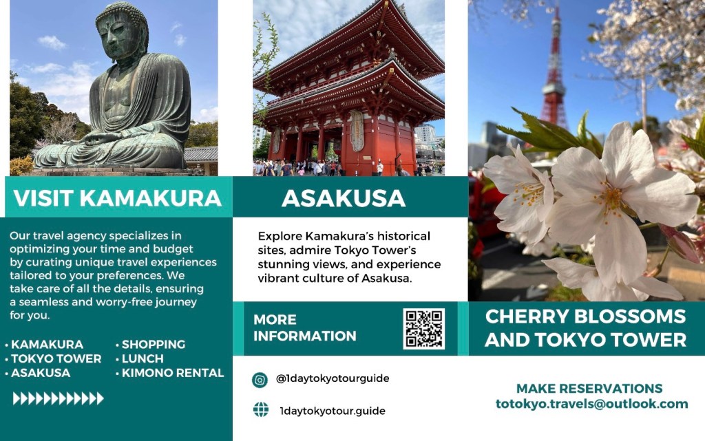 Let’s embark on a delightful tour to Kamakura to admire the iconic Great Buddha and explore its serene temples. Afterward, we’ll head to Tokyo Tower, dressed in beautiful kimonos, enjoying the stunning city views. Finally, we’ll visit Asakusa, where we can immerse ourselves in the rich culture, visit historic temples, and shop for unique gifts to take home.